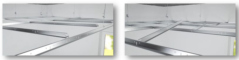 A instalação é realizada com uma estrutura metálica suspensa, composta por perfis e tirantes que sustentam as placas modulares.