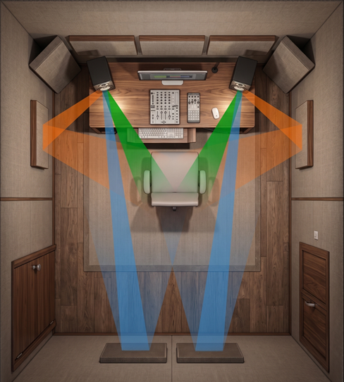 Reflexões precoces nas paredes, teto e mesa interferem no som direto dos monitores, reduzindo a definição e a precisão da imagem estéreo.