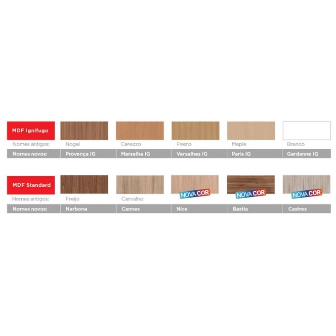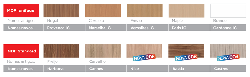 Painel de fibras de madeira de florestas renováveis produzido com resina antichama avermelhada, densidade 780 kg/m3, Classe E1 por baixa emissão de voláteis (EN 120), podendo ser revestido de melamina em padrão amadeirado ou folha de madeira.